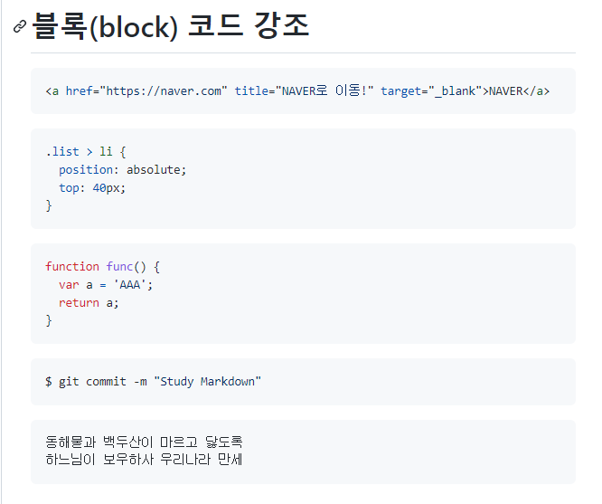 블록 코드를 강조할 때에는 벡틱 기호를 3번 입력하고 코드 종류도 작성합니다.